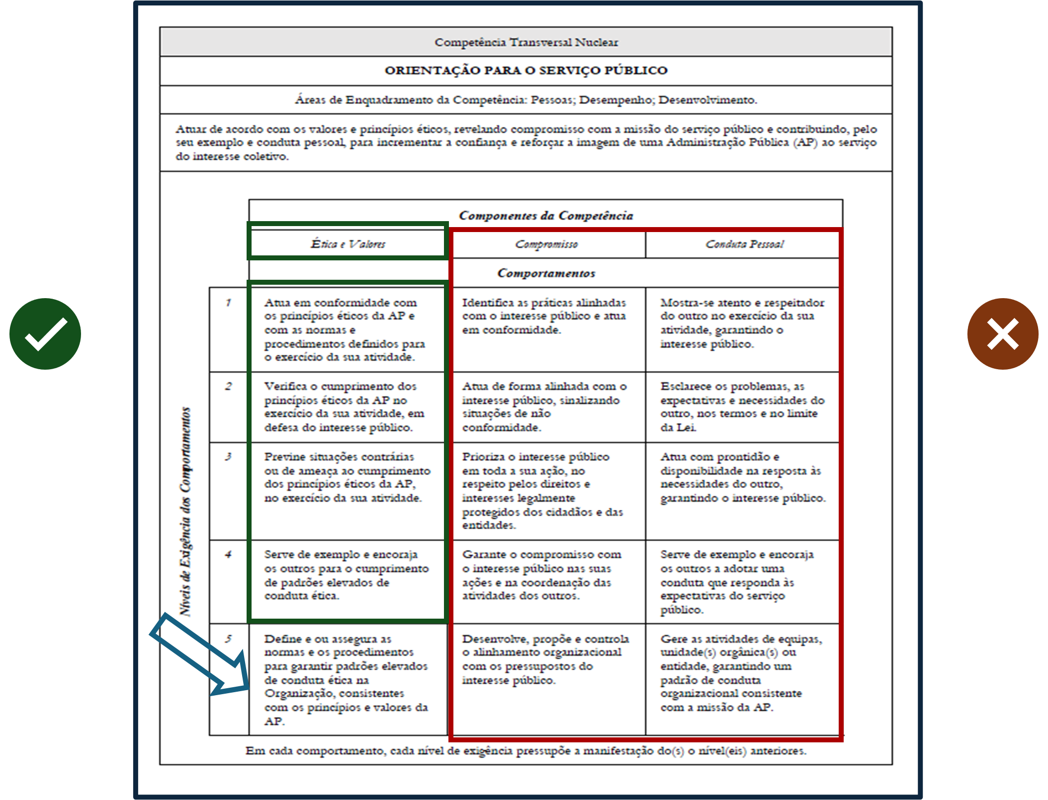 Caso, na competência «Orientação para o serviço público», se pretenda substituir o comportamento "Define e ou assegura as normas e os procedimentos para garantir padrões elevados de conduta ética na Organização consistentes com os princípios e valores da AP", da componente «Ética e Valores», apenas poderá ser escolhido um dos restantes quatro comportamentos que integram essa componente, não podendo ser escolhidos comportamentos que integrem as componentes «Compromisso» e «Conduta Pessoal».
